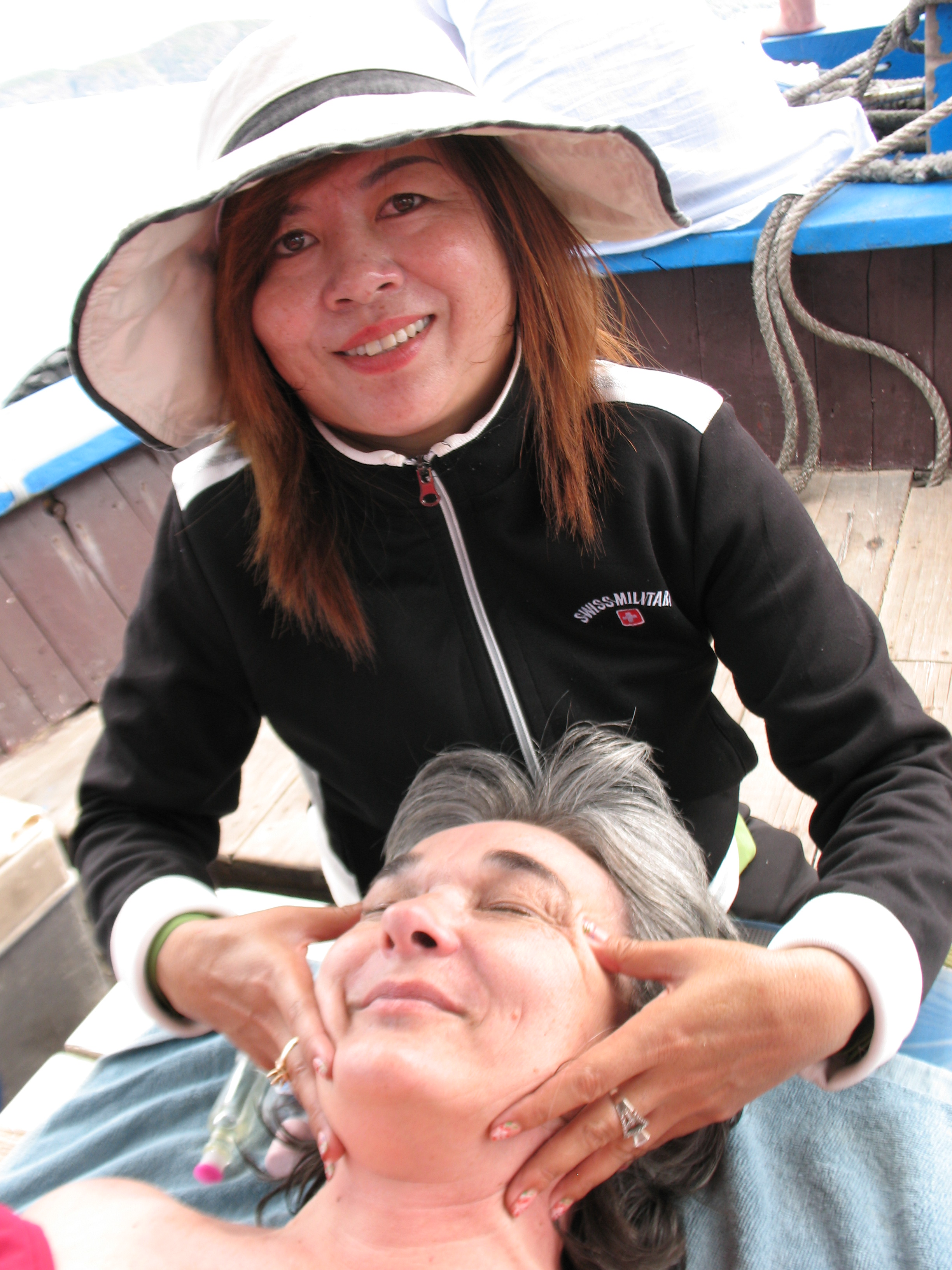 As our blue boat chugs out onto the water amid dozens of others just like it, Tin spreads out a towel on the sun deck and sets to work. Massage, manicure, pedicure, eye-brows (plucked and threaded)…she’s equipped to do the lot.