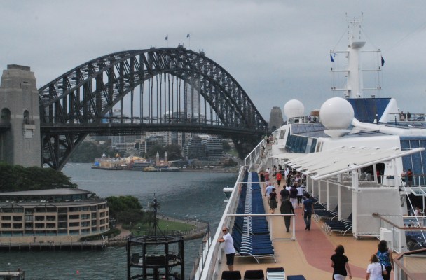 We’re having a night aboard the cruise liner Celebrity Solstice. And here it is before me, tied up between those two great icons, the Sydney Harbour Bridge and the Sydney Opera House. It dwarfs them both, at least from this perspective. The Sunday crowds on the wharf are gawping open-mouthed, cameras are clicking, and as I get closer I see the queues of passengers lining up to board.