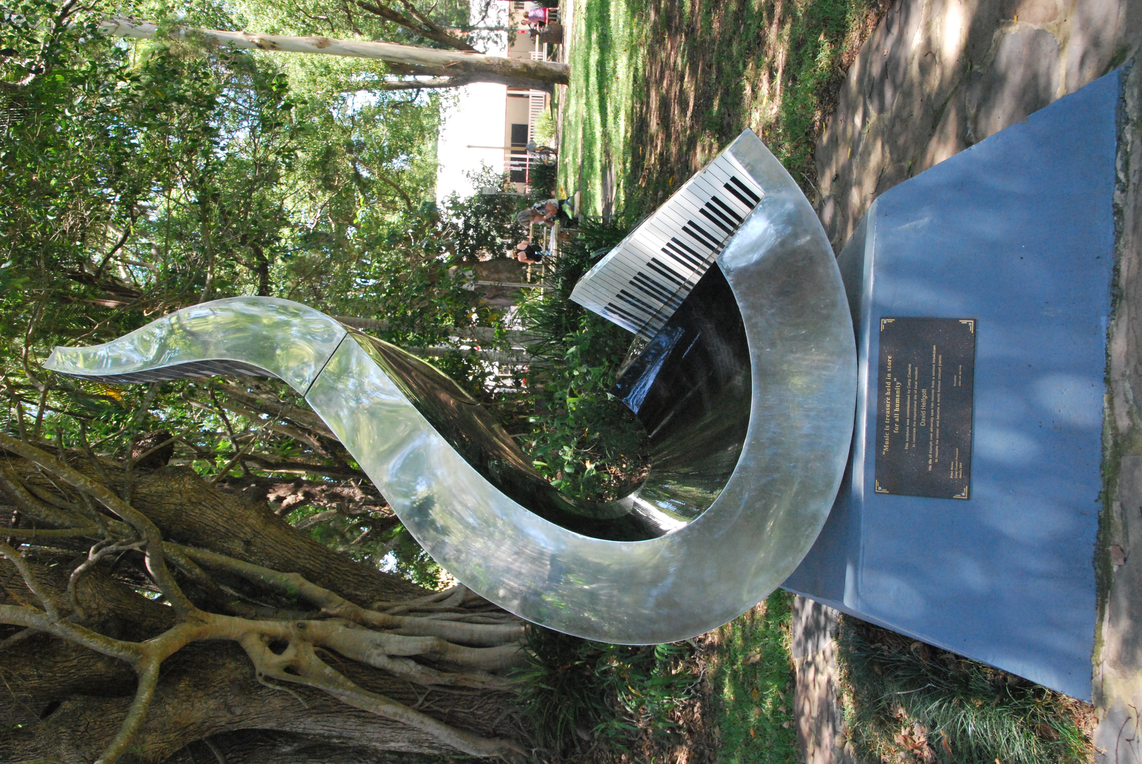 The Helfgotts often open the wonderful garden at their home for concerts and other events, and are benefactors to many of the talented young people of Bellingen, offering scholarships and mentoring. In 2009, Camp Creative honoured David with the unveiling of a 2.7 metre sculpture by the internationally recognised sculptor John Van Der Kolk in a park in Bellingen’s main street, in recognition of his “inspirational life” and his contribution to the community.