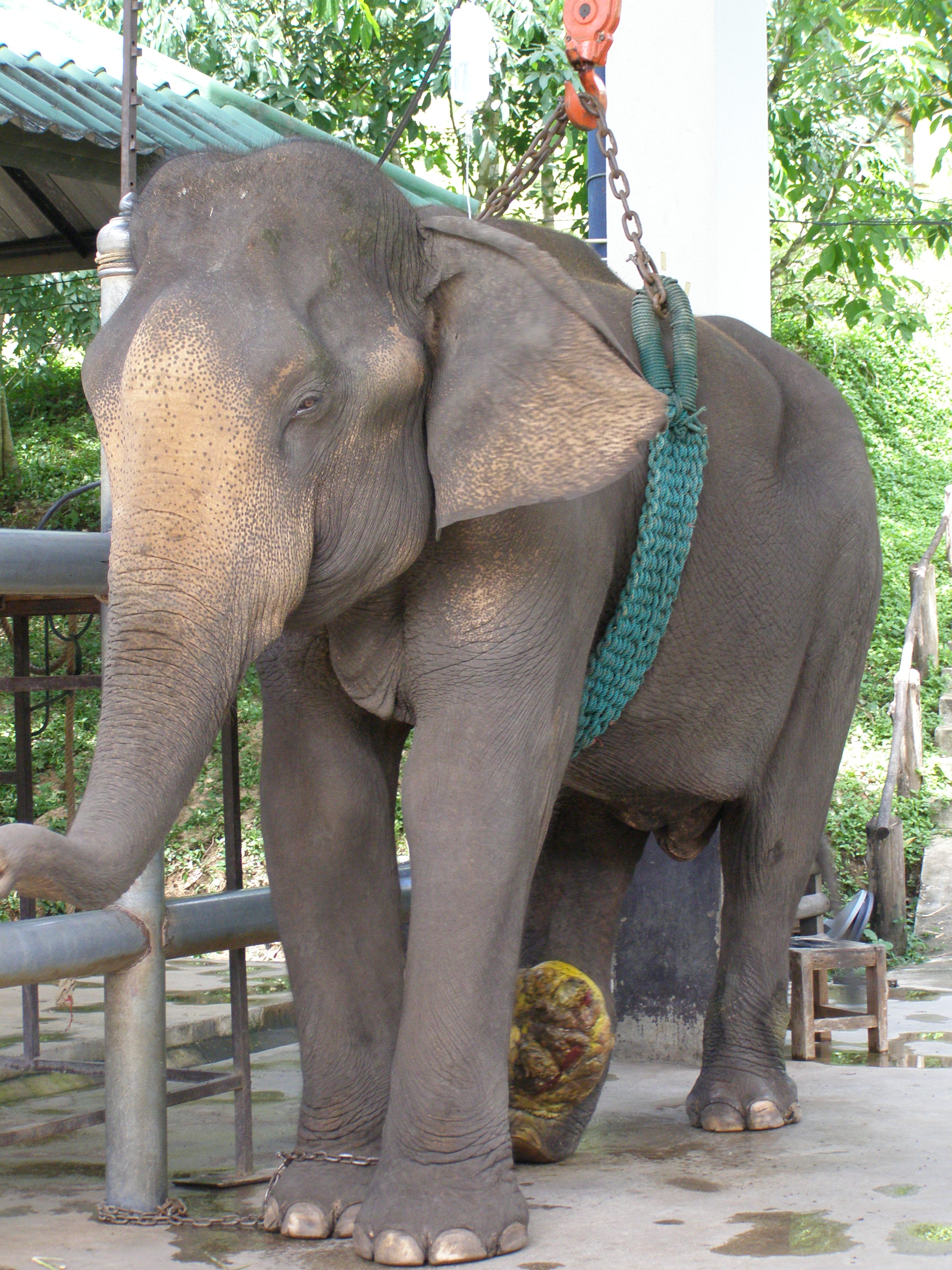 “The most effective way of treating this would be to amputate but he would die,” says our guide, specialist veterinarian Taweepoke Angkawanish. “Instead, we have been controlling the infection by antibiotic for six months and changing the dressing daily.”