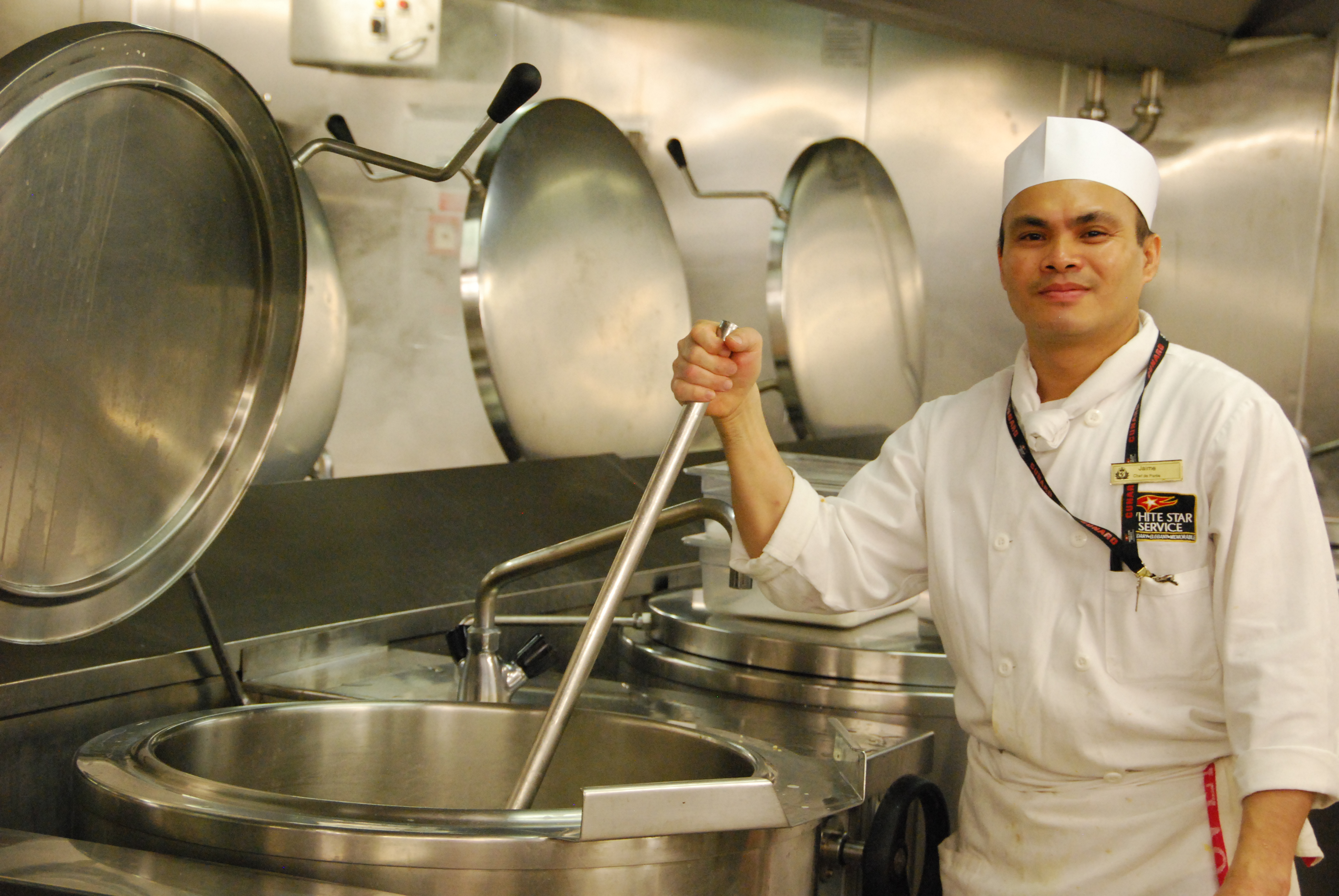 The galley behind the Britannia restaurant is vast, all gleaming stainless steel. We’ve arrived during preparations for lunch, and things are moving in a fast but very structured, efficient and controlled way.  Steam rises from huge vats of soup and sauces, chickens are being prepared in one area, appetisers being plated in another, and racks of bread and buns await.