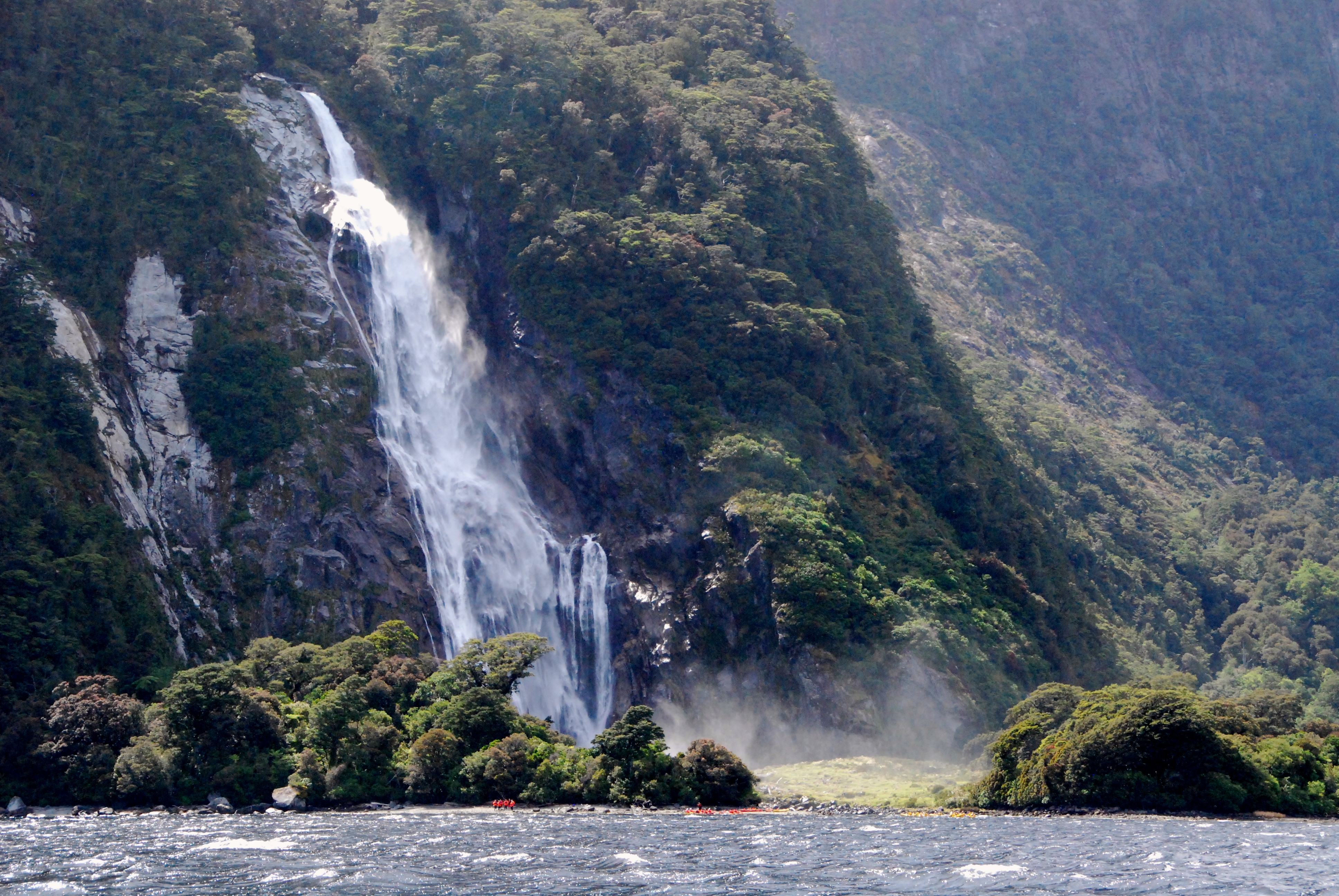 In places, Milford Sound is as deep as  400 metres deep and it is really a fjord – formed by a glacier –  rather than a sound, which is a valley flooded by the sea. The Maori name for Milford Sound is Piopiotahi meaning “Place of the Singing Thrush” (sadly, a bird now extinct).