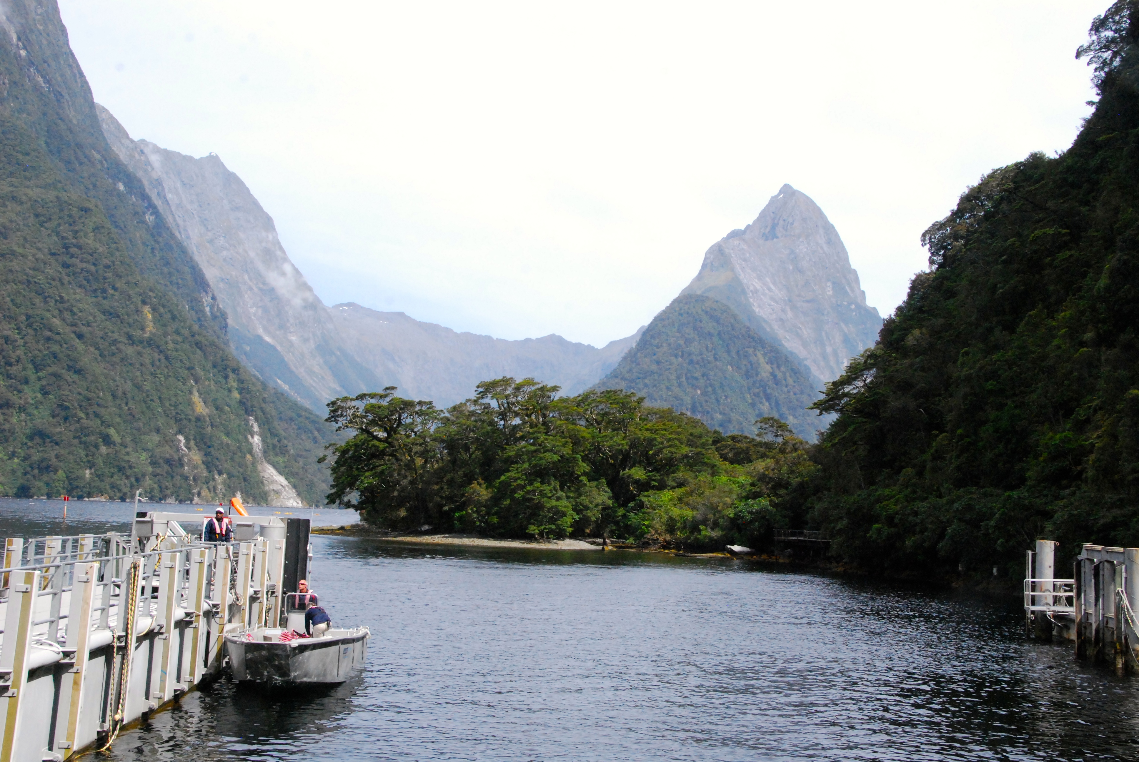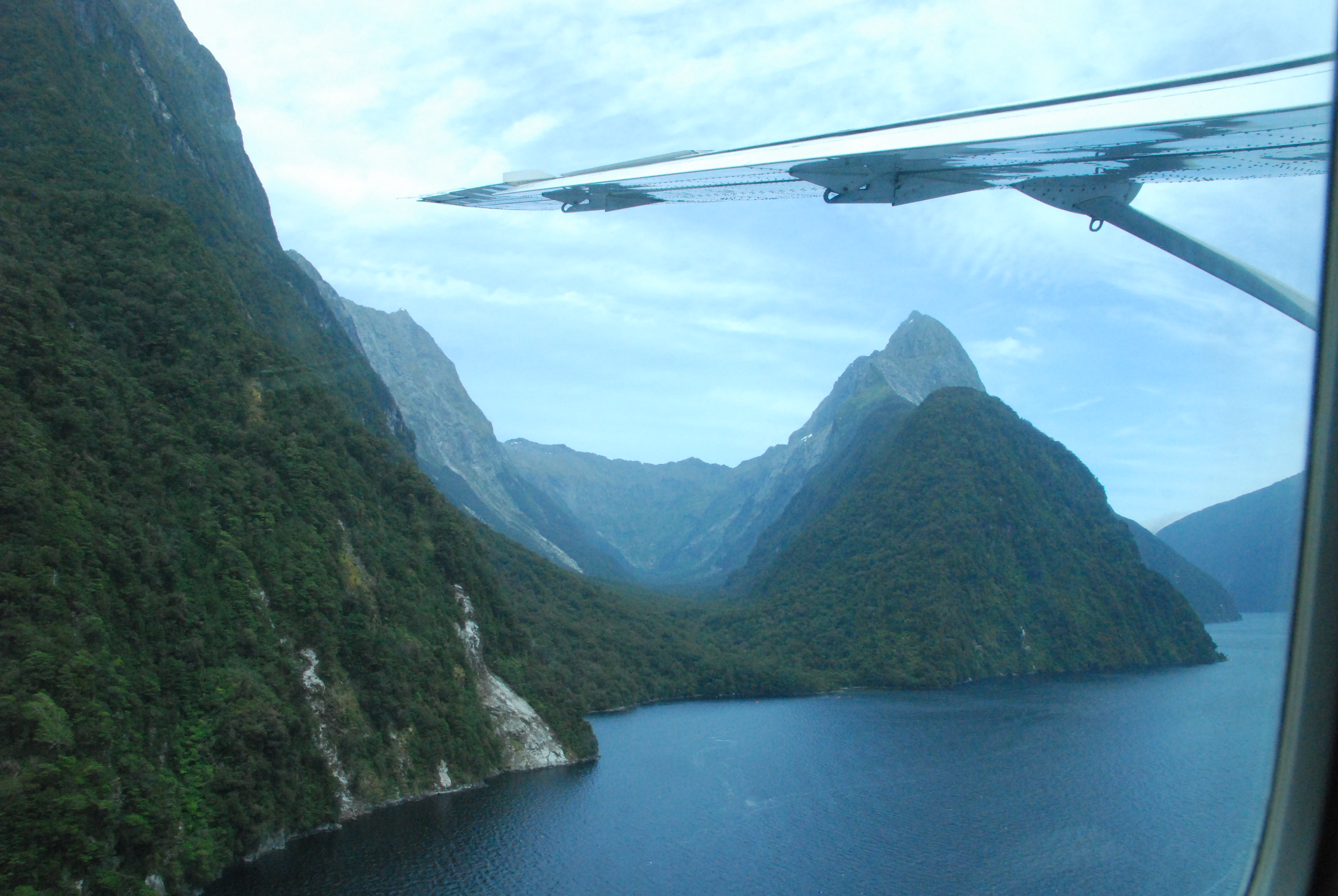 The small ship Island Passage waits in Milford Sound. Look carefully to the right of Mitre Peak and you’ll see a plane about to come in for landing.