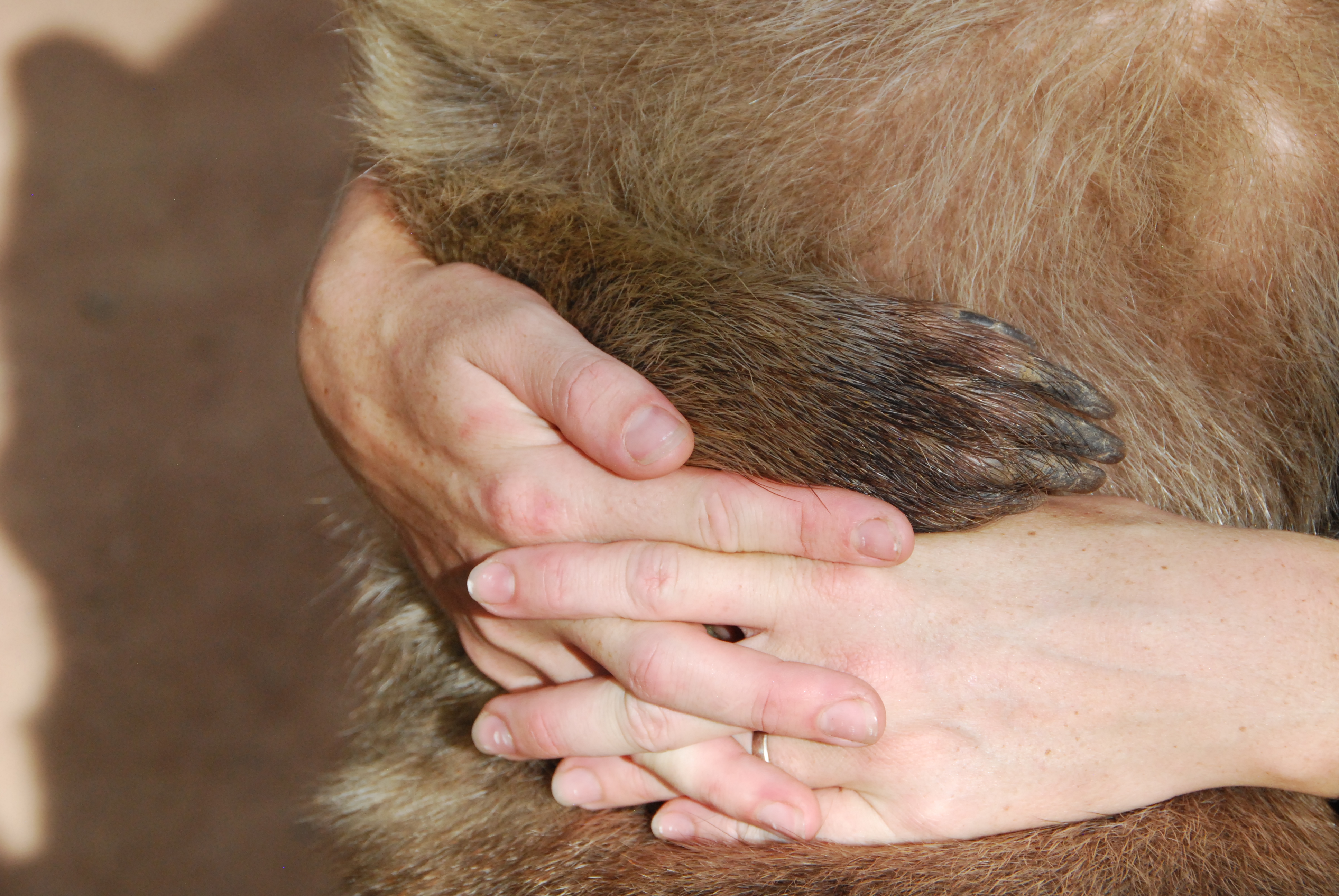 As we’re wandering back from a look at the crocodiles, ranger Amy is nursing Tonka the bare-nosed wombat. Tonka loves having his tummy and chin stroked, and is lying flat enjoying every minute of the attention. Tonka was almost a casualty of Cyclone Yasi; for weeks after the storm – while the park was closed to visitors and the rangers were busy cleaning up – he was moping around and losing weight. The veterinarian could find no physiological cause but finally diagnosed depression. When the park re-opened and the wombat shows re-started, Tonka suddenly perked up and started gaining weight. The diagnosis was clear: he had missed the daily contact with people.