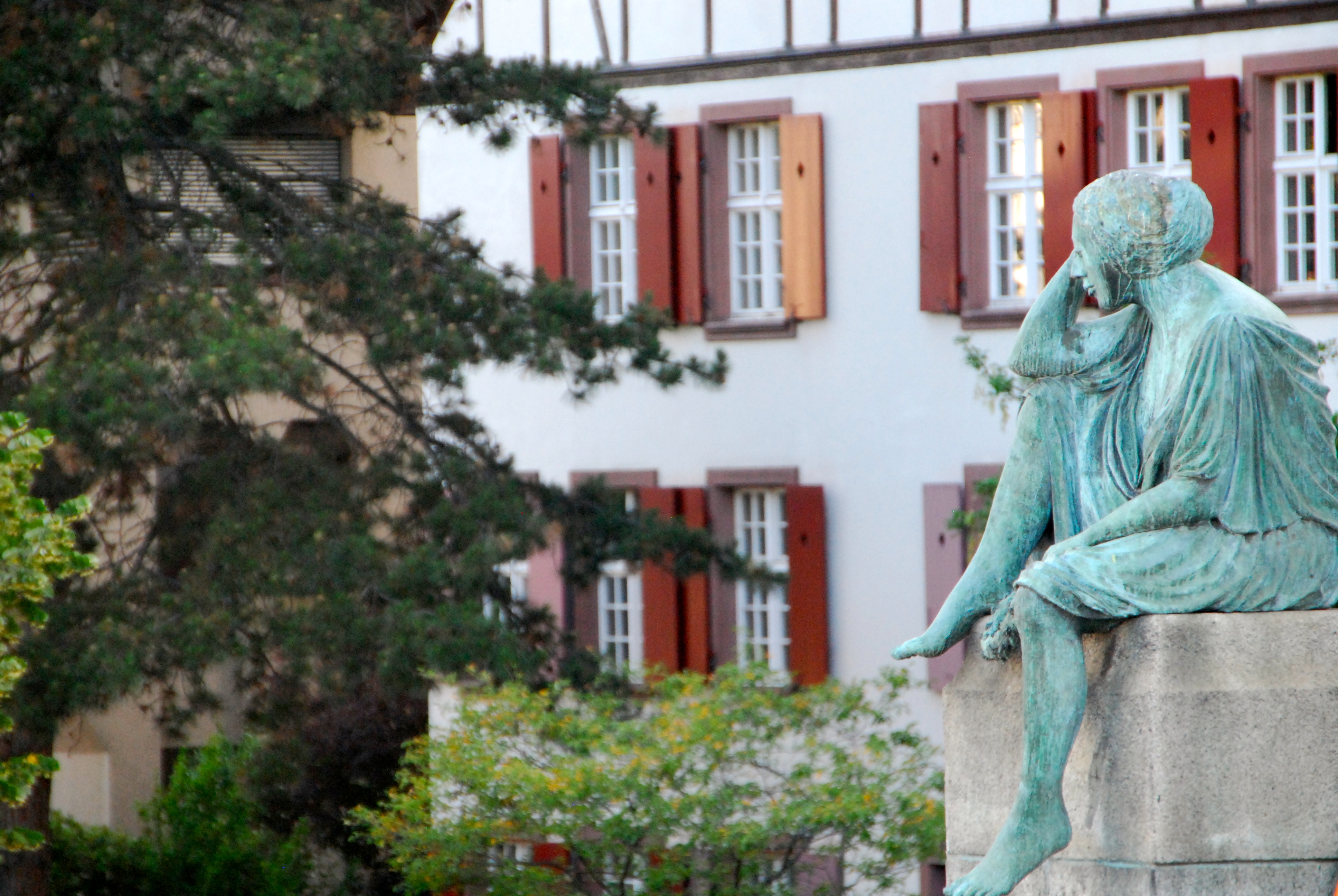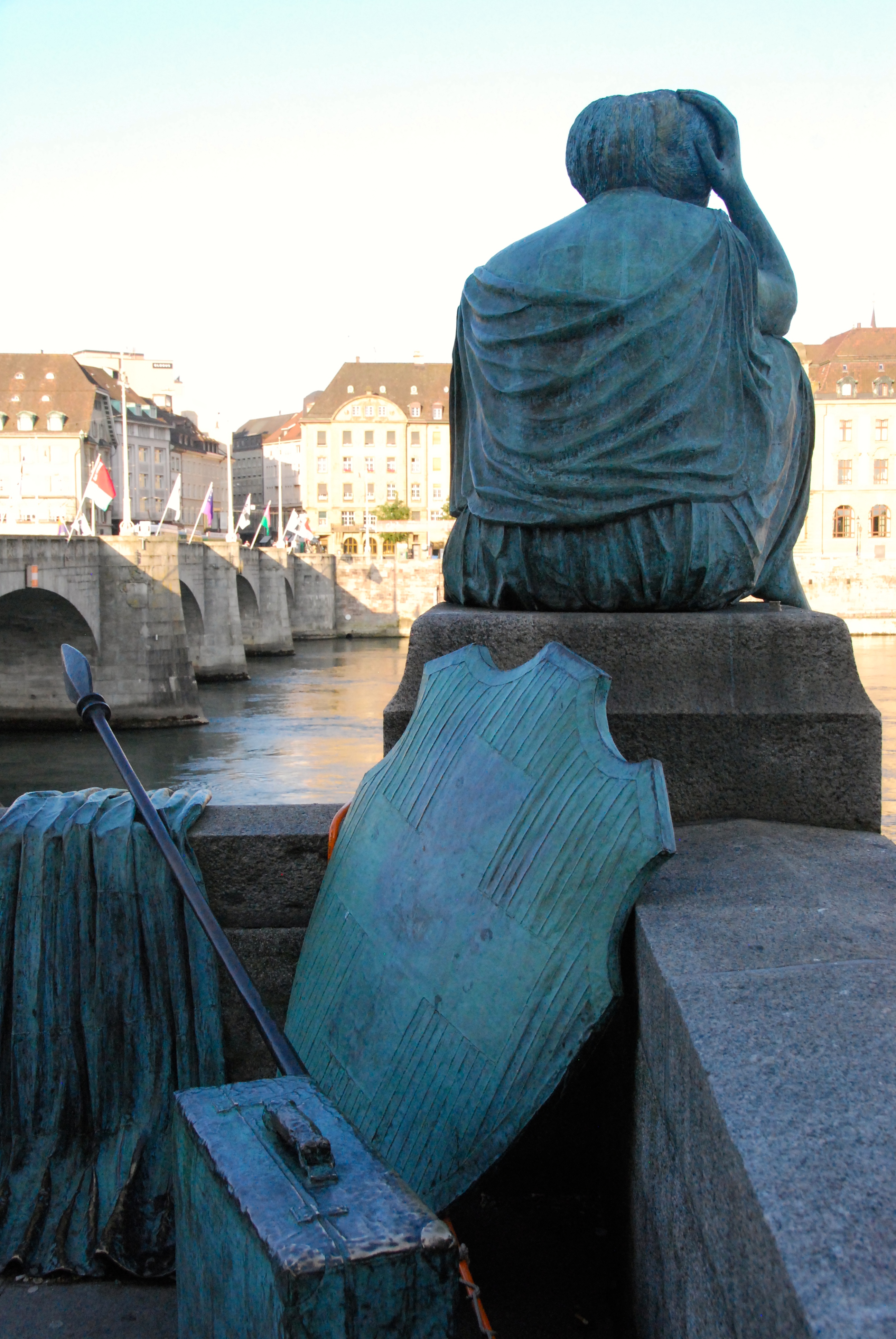 I met Helvetia on an early morning walk on my second day in the Swiss city of Basel. I didn’t know who she was then, but the more I learned about her, the more I liked her. My eye was drawn by her pensive pose, as she perched high on a wall above the left bank of the Rhine. The sunlight made the windows of the building behind her glow, and I walked closer for a better look at this intriguing figure.