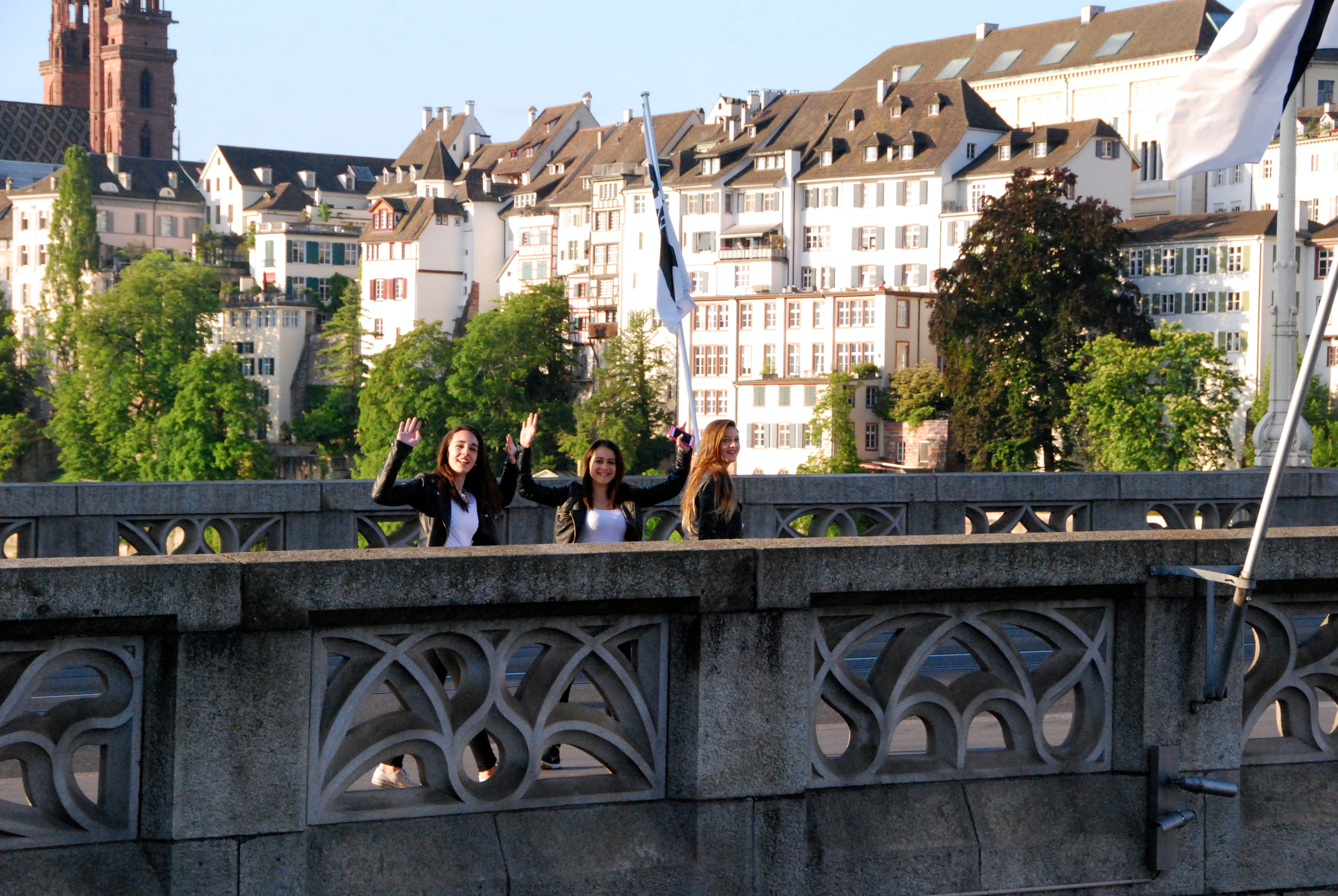 What does she see?  At this time of day, it is peaceful.  A trio of young women – out early or on their way home after a night out – wave for my camera as they head across the bridge to Kleinbasel (little Basel), on the right bank. Ducks skim the water.  Later, the trams will begin to rattle over the bridge, and swimmers will cast themselves in to the swift current to float past her, barely giving her a glance. Boats will start to move up and down the powerful waterway, and the people of Basel – and the many tourists exploring this lovely city – will be out in force.