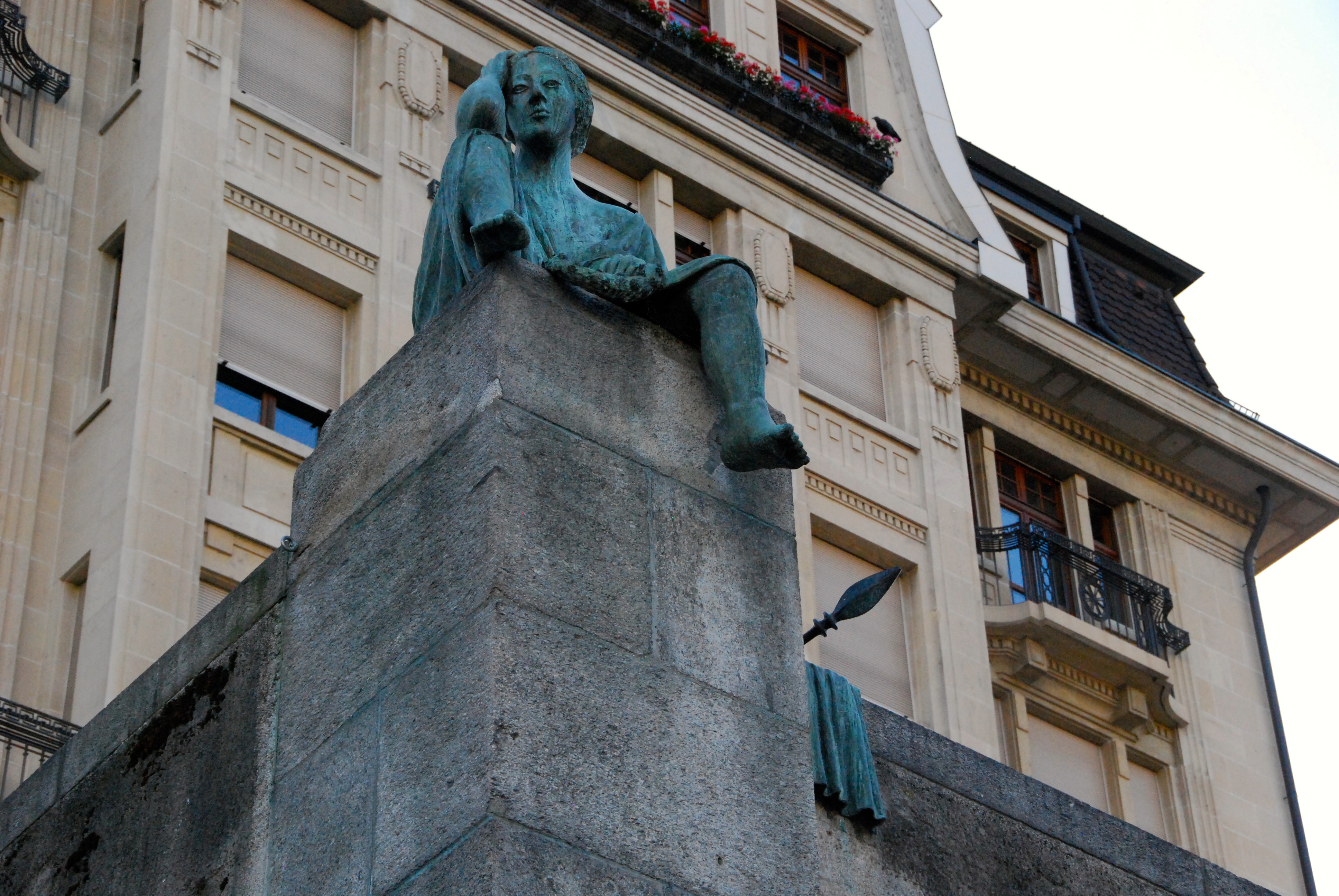 My admiration was immediate, and I wanted to know more about this wonderful sculpture. Later I found out that it is “Helvetia on her travels” (“Helvetia auf Reisen”), by artist Bettina Eichin. Created around 1979/1980, Eichin’s Helvetia has a new slant on the figure so often seen on Switzerland’s stamps and coins.  I remembered her from my young days as an avid stamp collector, but this depiction makes her seem much more human.
