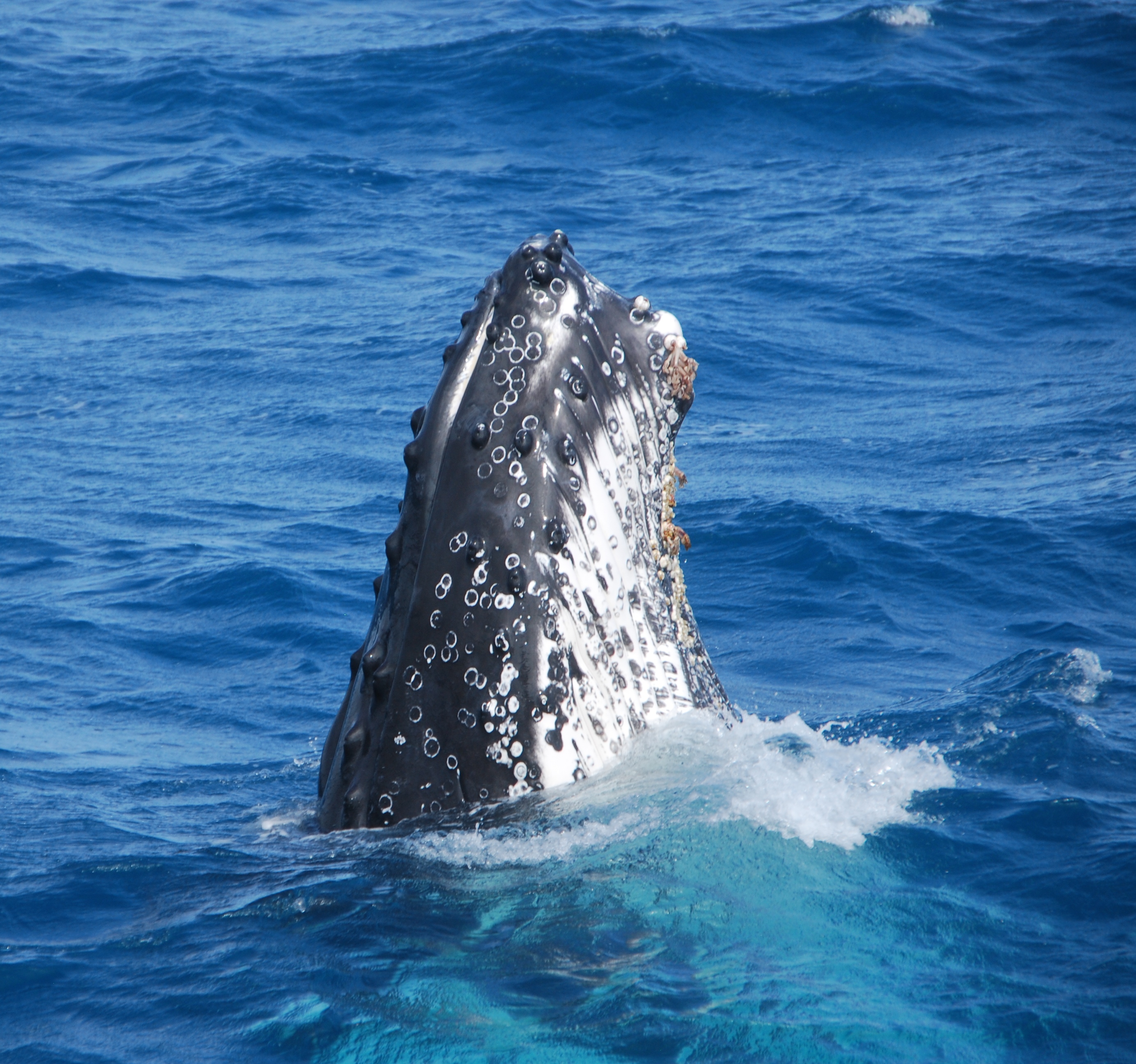 Shutters clicked, there were gasps of delight, and arms waved wildly to attract these keen-sighted mammals. The whales swam close to the boat, under it, around it…popping up now and then to have a good look – a move called “spy-hopping”. Tails waved in the air, pectoral fins slapped the water…it seemed almost as if they were as happy to see us as we were to get a good look at them! At one point, three whales popped up simultaneously – to the delight of those on the boat!