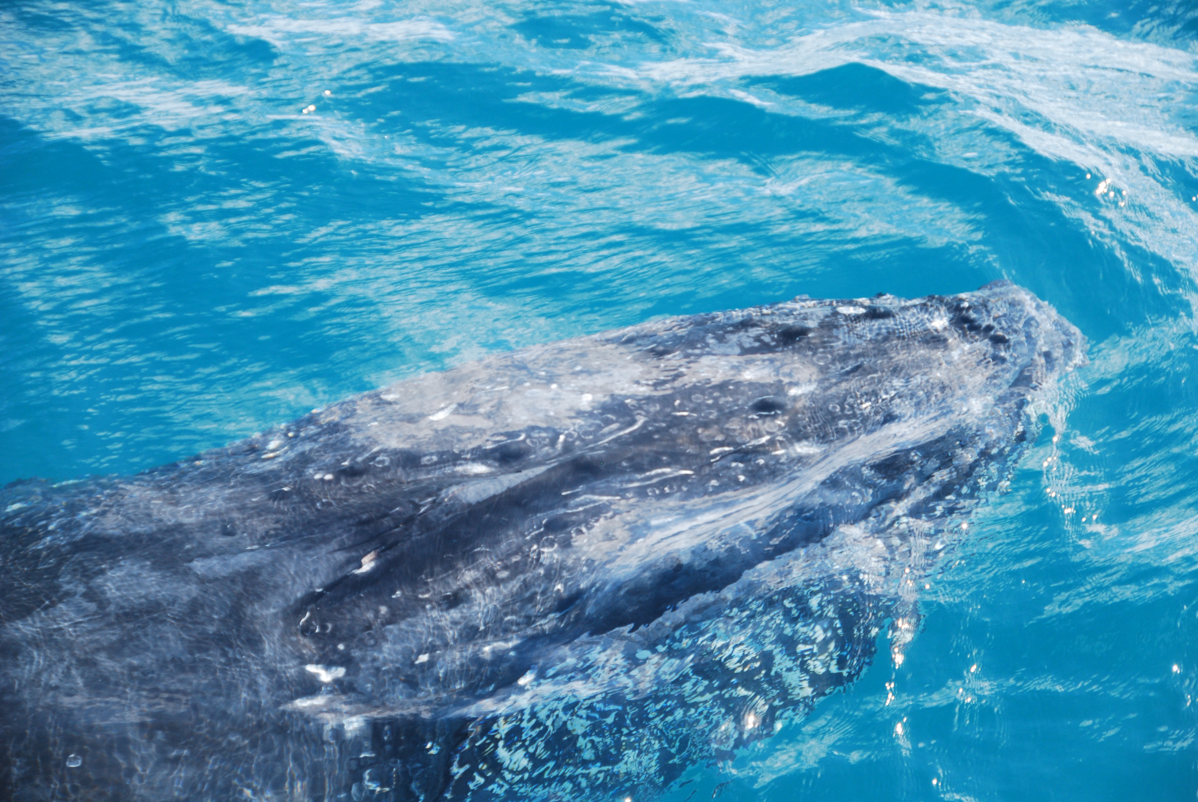 On both mornings I was aboard Quick Cat II, the weather was mainly overcast and windy, and the water quite choppy. And the whales were very active! But not getting into the water did not mean we didn’t have close encounters. On the first day, three pods came over to have a look at us.  The first was three whales (a pod is two or more), but there was great excitement when after spotting our third pod of the day, it came together with the second pod!  In one extraordinary moment, we had four giant humpbacks lined up in a row, swimming toward the boat for a closer look at us.
