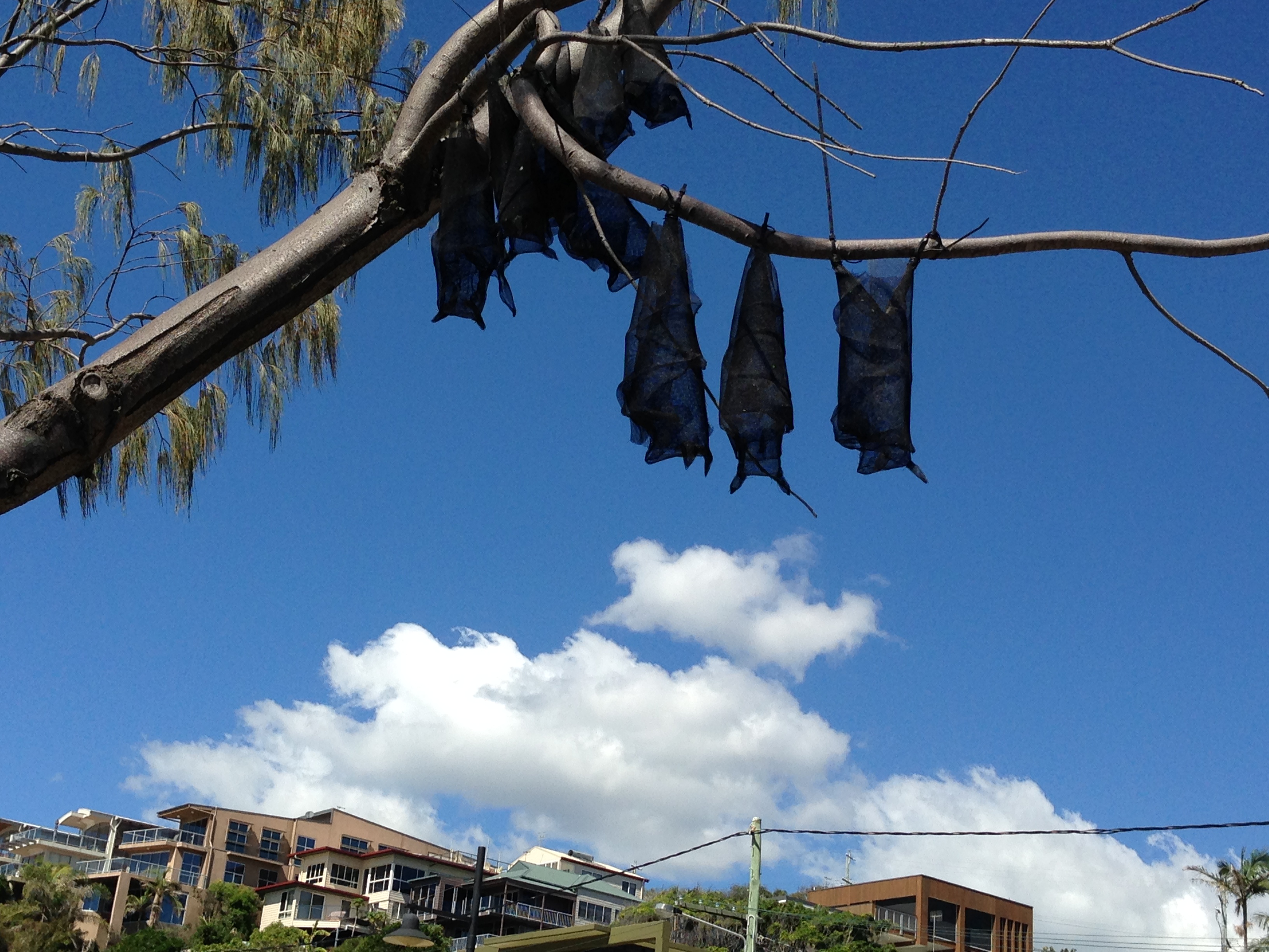 Post Colonial Colony, by Catherine Lane & Linelle Stepto (NSW). Bats made of flyscreens, hanging all over this (real) tree.