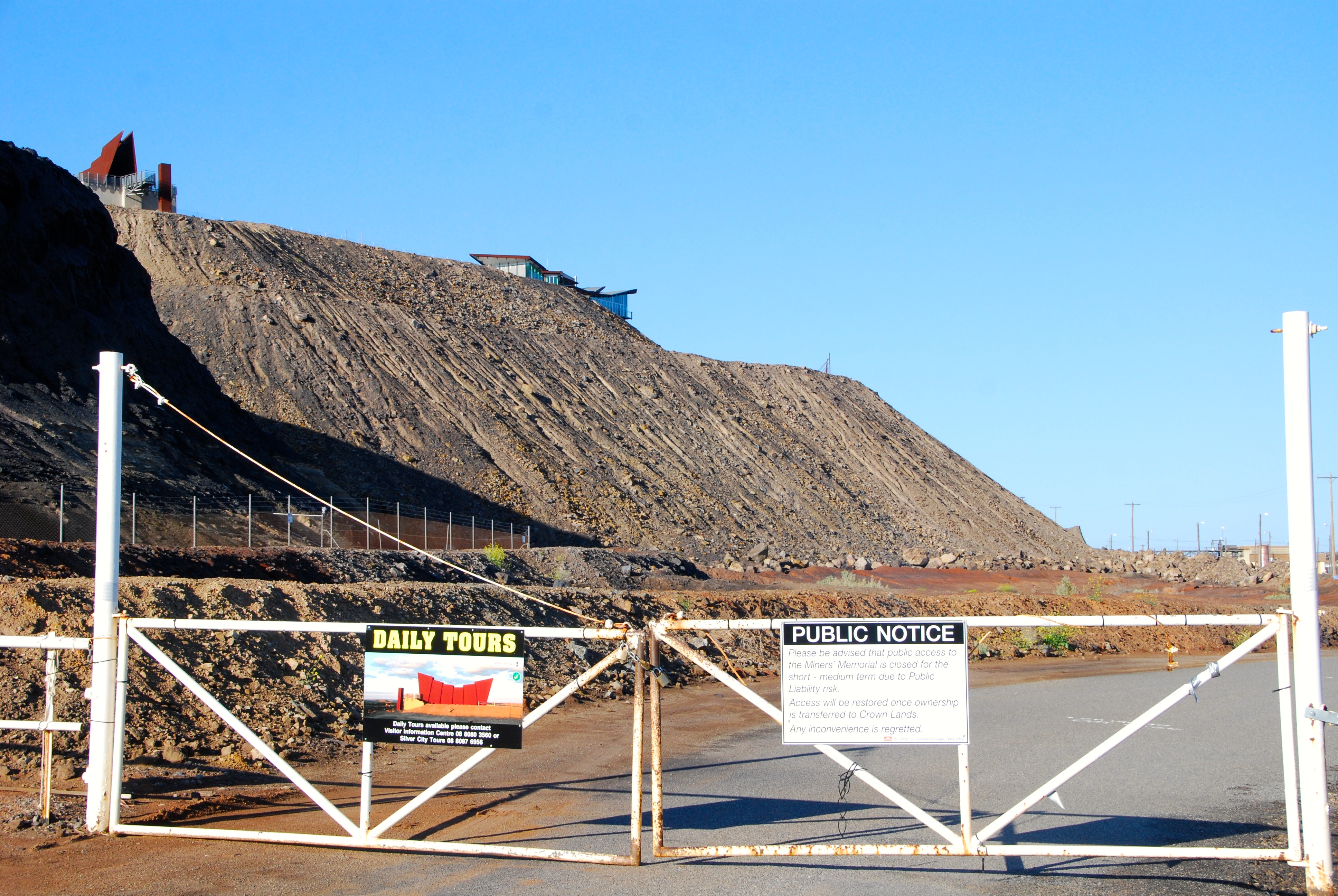 Along with the Broken Earth restaurant and a lookout, the memorial makes a dramatic impact, sitting high on the edge of the mullock heap that bisects the city. Floodlit at night, it was also a wonderful spot for panoramic view of the city. However, the land on which they sit is part of a mining company lease. When the restaurant closed in January, the mining company and cafe operator kept the gates to the popular tourist site open. But then the problem of public liability insurance raised its head; a local told me that a visitor had fallen and broken their arm, an accident that was then classed as a “mining accident” because it happened on within the mining lease area.