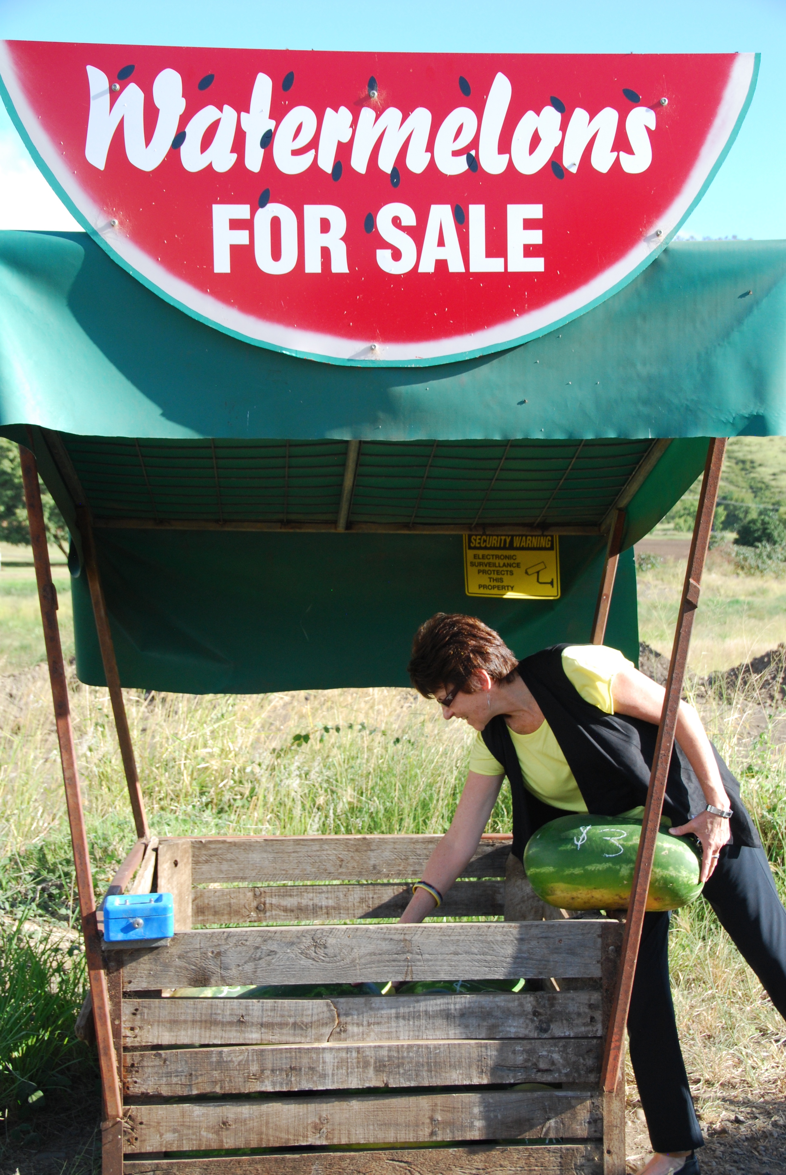Watermelon juice is dripping down my chin, and my hands are covered in it.  Beside a creek on a country road, I’m tucking into a giant slice of sweet seedless melon and don’t care how messy I’m getting. The melon has come from a roadside stall, with “honesty box” for payment…and after a few days in farming country I’m even more convinced that there’s no better way to go food shopping.