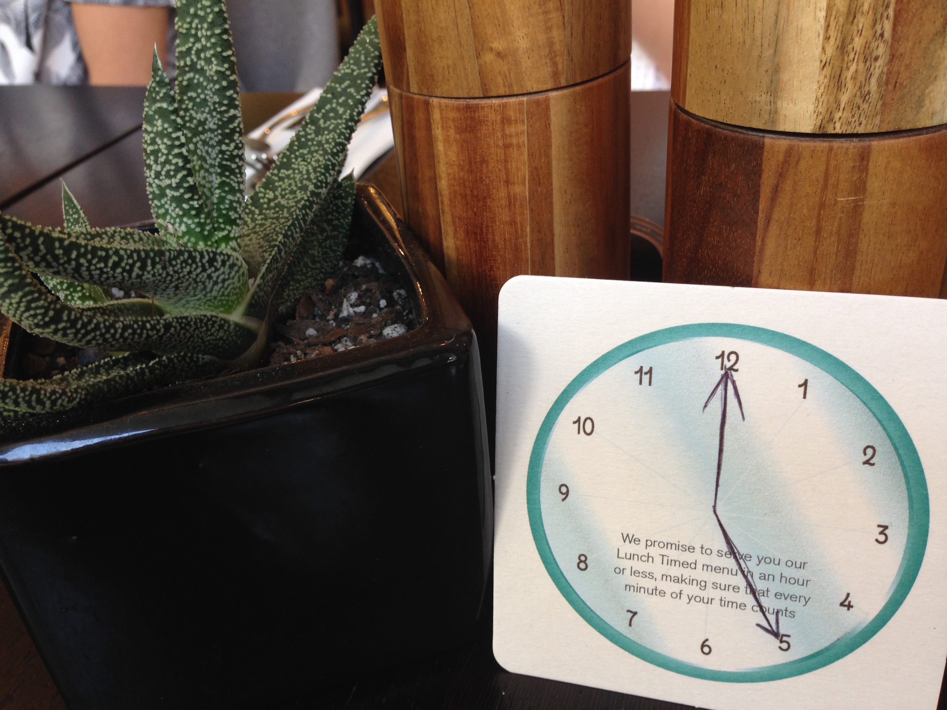 Executive chef Todd Adams has a set three-course lunch menu, with a choice of main course. We ordered drinks and mains, and when the order had been delivered to the kitchen a card with a clock – the hands marked at our time of order – was placed on the table.