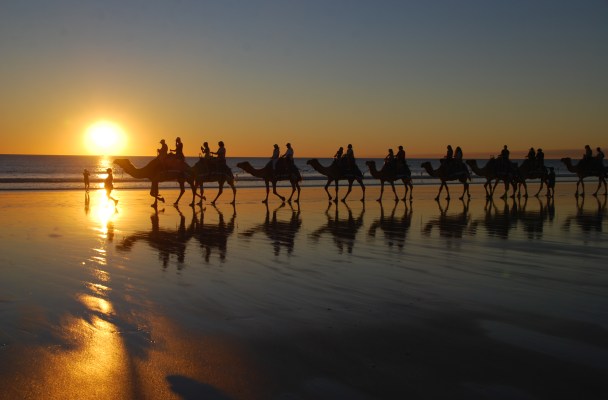 And nowhere is that experience more exotic than from Cable Beach, near Broome, where crowds gather on the sand at twilight in preparation for the end of the day. Beach chairs are set up, wine coolers opened, beers cracked and the cameleers load up their charges with eager tourists to walk the length of the beach. They start before the sun gets too low in the sky, turning to come back along the beach as the full effect of the sinking sun takes over.