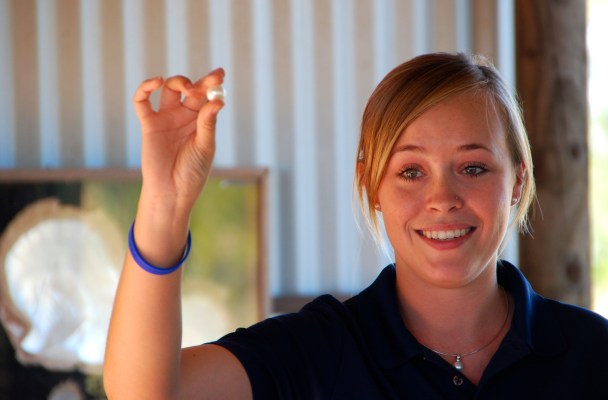 Holding up an oyster shell in which the pearls forms, Emma refers to it as a male. “How do I know it’s male?” she asks. “Because it’s got no brain and a gonad.” Laughs all round.