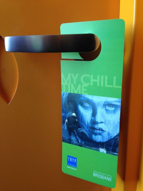 Closer to home, the hip Tryp Fortitude Valley Hotel in Brisbane, adorned inside and outside with lots of huge murals by renowned street artists, includes a shot of an artist at work for guests to hang on the door handle when in need of “chill time”.