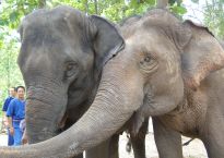 The elephant looms disconcertingly close, snuffling my foot with her warm breath and leaving a mix of mud and saliva on my open-toed shoe. “Thank God…
